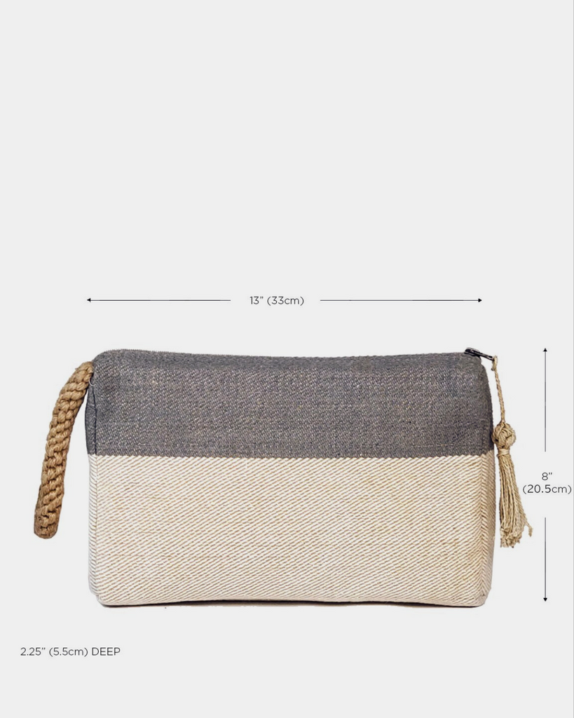 The Brenta Clutch evokes the secret language of tide-washed rock and sun-faded stone—and features a distinct colorblock weave in gray and ivory. Woven from jute-cotton, the texture is substantial, sculptural and clean-lined. Tailored, yet effortlessly relaxed.