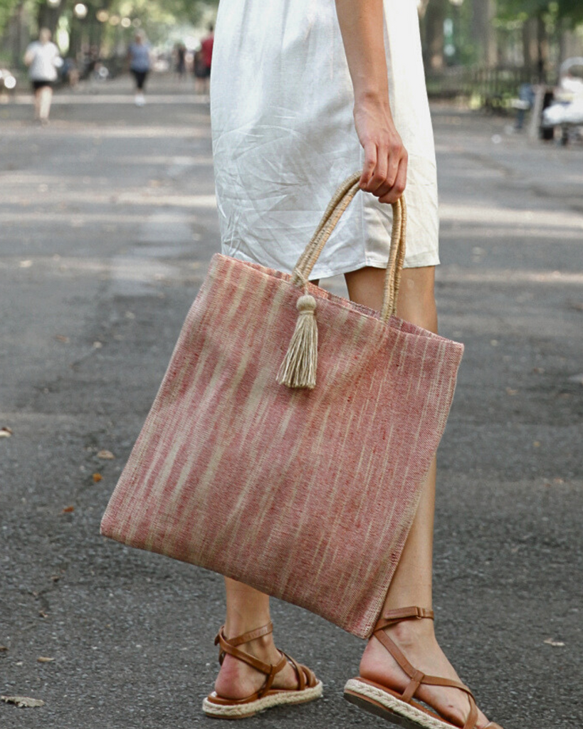 Woven by hand from natural jute and earthy red, the ARRA Tote features an interlaced pattern that celebrates both texture and tone—earthbound, matte, and minimal. Natural variations highlight the rhythm of the loom, with a subtle yet substantial weave.