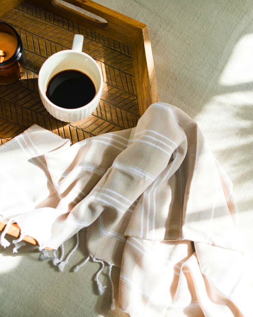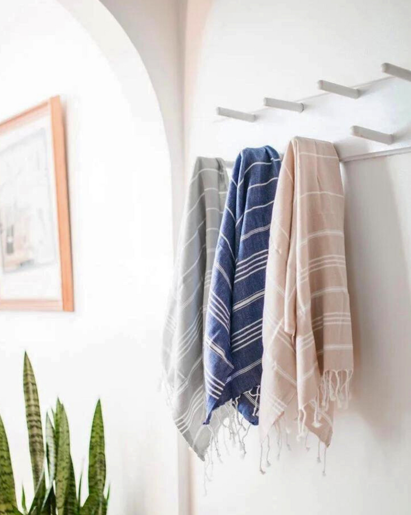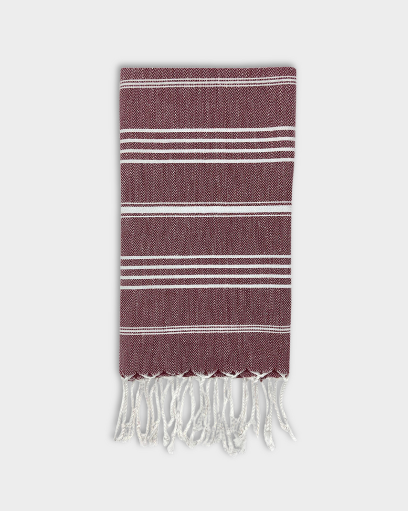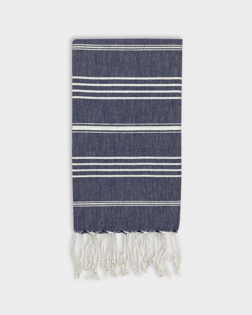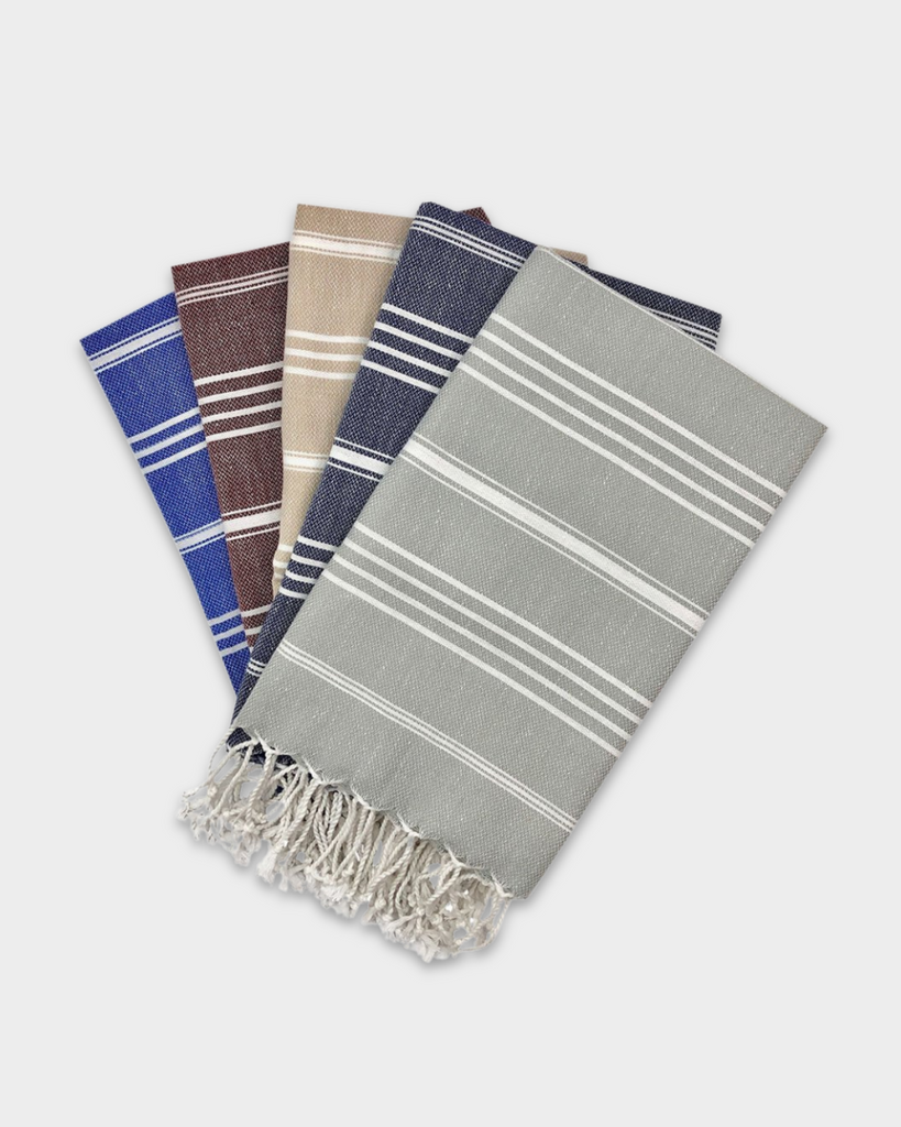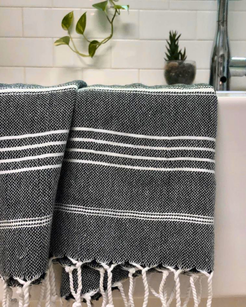 Originally used in Turkish baths, Turkish towels, also known as peshtamels or hammam towels, have been traditionally hand-loomed in Turkey for centuries. They are made using extra-long, tightly woven fibers which makes them lightweight, yet highly absorbent.