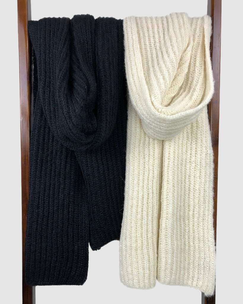The ARIS oversized alpaca scarf can be worn multiple ways and is the perfect accessory for layering on cold evenings. Alpaca fiber is considered to be one the greenest, most natural and softest fibers in the world. It is prized for its unique silky and luxurious feel and has a lesser tendency to pilling. The ARIS alpaca scarf is made on a hand knitting machine by a weaving collective in Peru.
