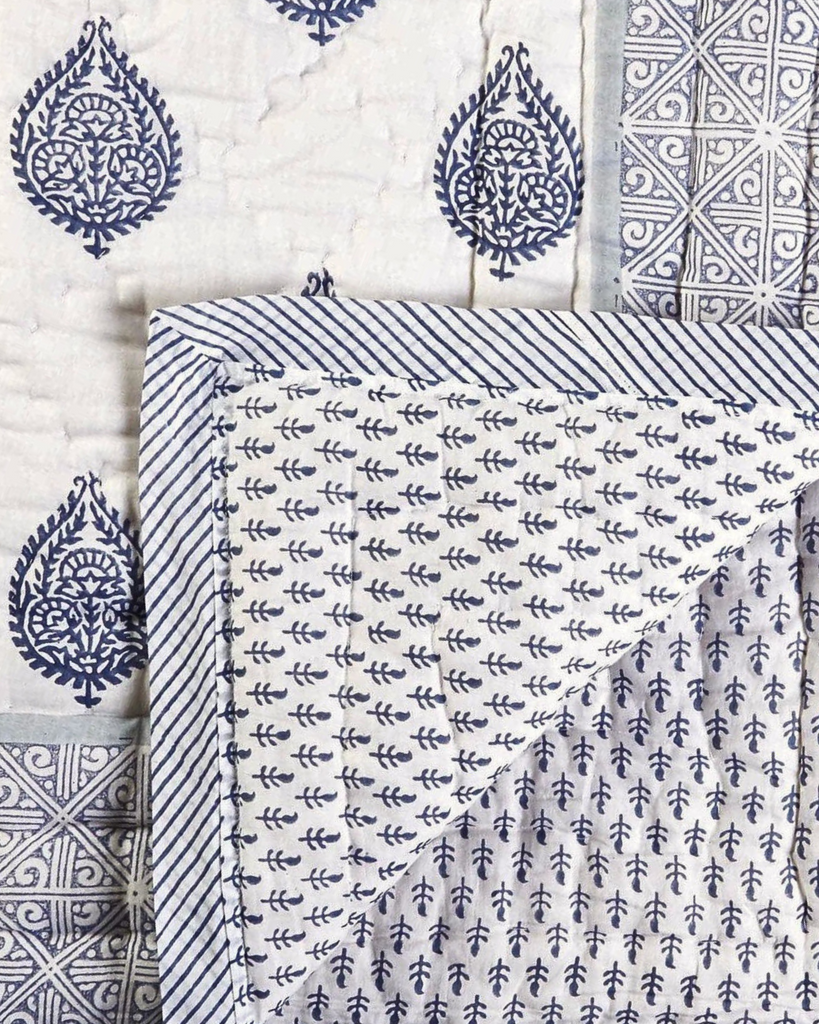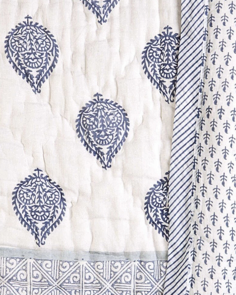 Our LAPIS Handcrafted Baby Quilt is made with a luxuriously soft hypoallergenic cotton voile exterior, and delicately filled with natural cotton for unparalleled coziness and warmth. Hand-quilted and block-printed, every quilt is unique and perfectly sized for baby. Features a reversible design and is edged with blue trim.